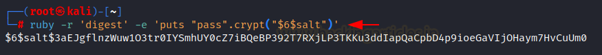 ruby -r ‘digest’ -e ‘puts “pass”.crypt(“$6$salt”)’