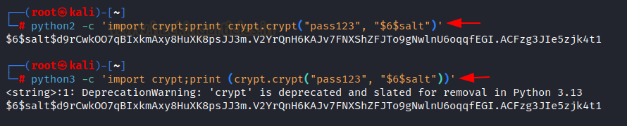 python3 -c 'import crypt; print (crypt.crypt("pass123", "$6$salt"))'