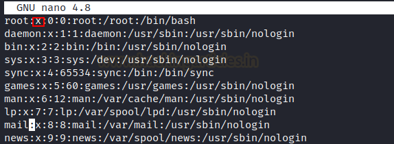 If /etc/passwd file is having -rwxrwxrwx permissions in victim system, open /etc/passwd file and remove the ‘X’ or ‘*’ value at the place of root password. As shown in image below: