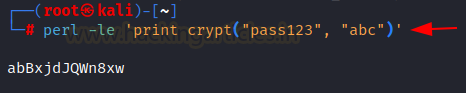 perl -le 'print crypt("pass123", "abc")'