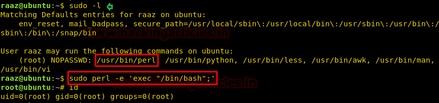 Now you can observe the highlighted text is showing that the user raaz can run Perl language program or script as root user. Therefore we got root access by executing Perl one-liner.