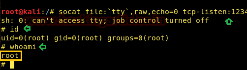 Now let’s try to get root access through socat with the help of following commands. Execute below command on the attacker’s terminal in order to enable listener for reverse connection.