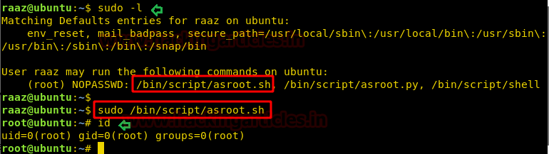 The highlighted text is indicating that the user raaz can run asroot.sh as the root user. Therefore we got root access by running asroot.sh script.
