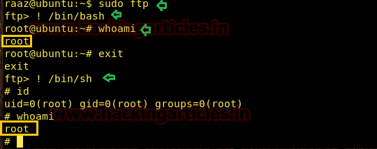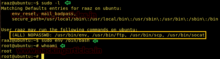 As we can observe user: raaz has sudo rights for env, FTP, SCP, and Socat, now let’s try to get root access through them one-by-one.