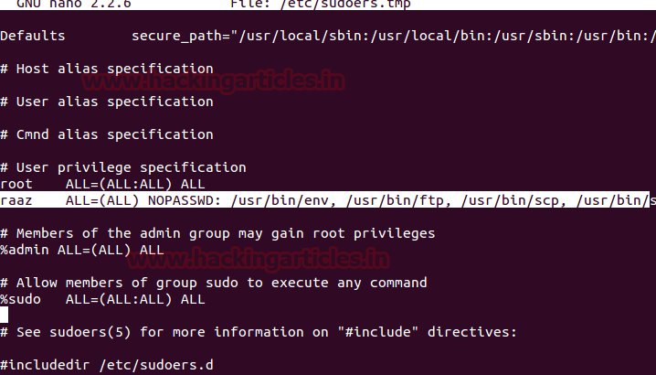 As we have seen above, some binary programs with sudo right are helpful in getting root access. But apart from that, there are some application which can also provide root access if owned sudo privilege such as FTP or socat. In given below command we have assign sudo rights to the following program which can be run as root user.