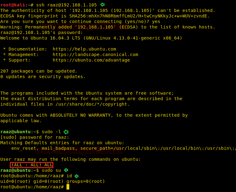 On other hands start your attacking machine and first compromise the target system and then move to privilege escalation phase. Suppose you successfully login into victim’s machine through ssh and want to know sudo rights for the current user then execute below command.
