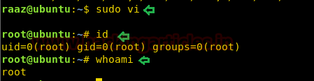 Here you can observe the highlighted text which is indicating that user raaz can run vi command as root user. Consequently, we got root access by executing the following.