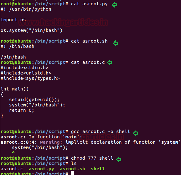 For example, we have some scripts which will provide root terminal on execution, in given below image you can observe that we have written 3 programs for obtaining bash shell by using different programing language and saved all three files: asroot.py, asroot.sh, asroot.c (compiled file shell) inside bin/script.