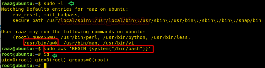 At this phase, you can notice the highlighted text is representing that the user raaz can run AWK language program or script as root user. Therefore we obtained root access by executing AWK one-liner.