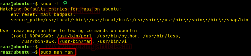Here you can observe the highlighted text is indicating that the user raaz can run man command as root user. Therefore we got root access by executing the following.