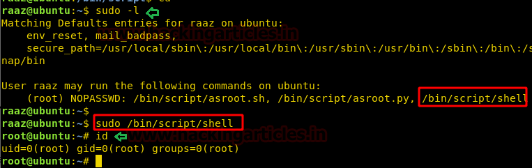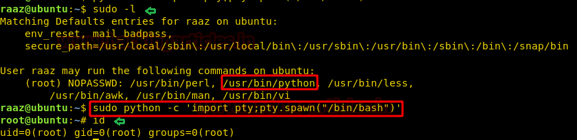 At this point, you can perceive the highlighted text is indicating that the user raaz can run Python language program or script as root user. Thus we acquired root access by executing Python one-liner.