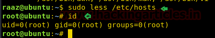 Here you can observe the highlighted text which is indicating that the user raaz can run less command as root user. Hence we obtained root access by executing the following.