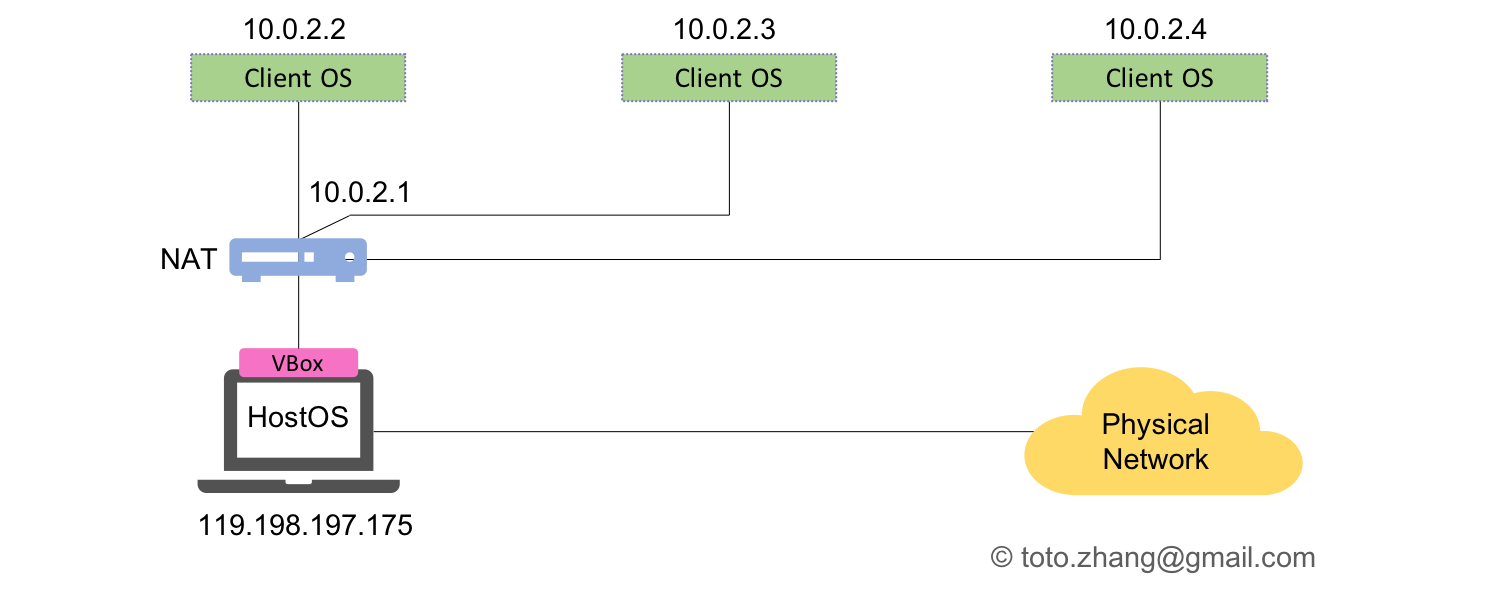 If the host os can access the Internetso does the client os. From the physical network point of view, all of the packets which actually come from the different client os, are all from the Vbox process. At the same time, it’s also show us that the NAT network can be recursive. Now, if any user from the physical network need to access any of the client os in VBox, port forwarding setting should be considered.