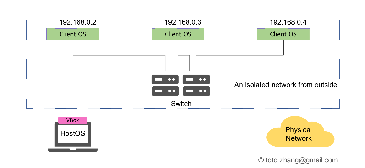 In this mode, client and host machine are bridged in the same ethernet segment. In other words, the clients are connected to the physical network directly. If there’s a DHCP server, the clients get IP addresses automatically. Theoretically, in the bridged mode, either the clients or the VBox itself can provide the DHCP service for the network, and it highly possible result unpredictable conflicts. It’s not recommended to do this.