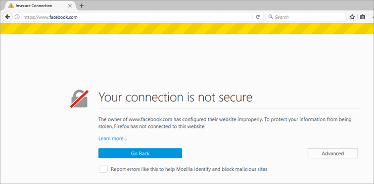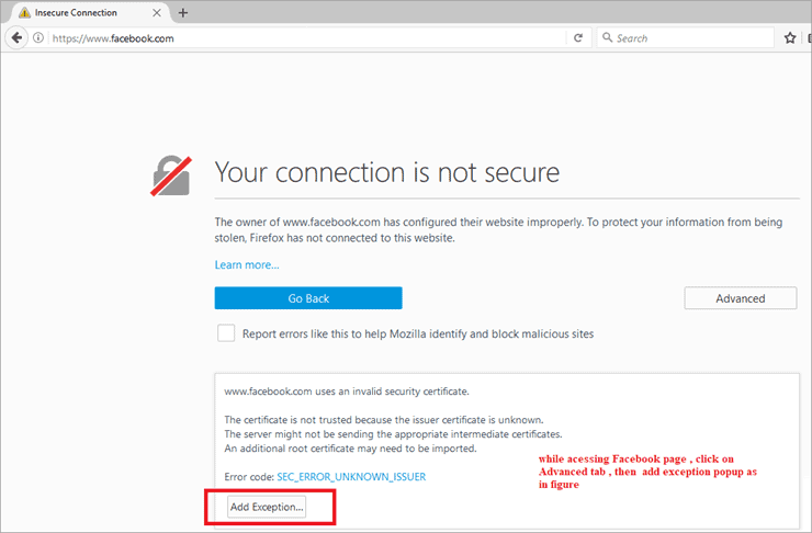 Try to connect your application using your browser. Here, I have tried to connect Facebook and it says your connection is not secure. So you need to add an exception, and then confirm Security Exception for navigating to the Facebook page. Please refer the screenshots below: