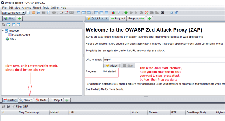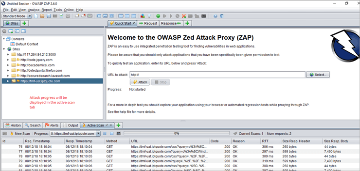 Active Scan: We can perform an Active scan using Zap in many ways. The first option is the Quick Start, which is present on the welcome page of the ZAP tool. Please refer the below screenshot: