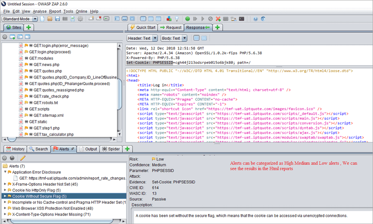 Once an active scan is completed, we can generate an HTML report for the same. For this, select Report -> Generate Html Report. I have attached a sample content of HTML reports. Here, high, medium and low alerts reports will be generated.