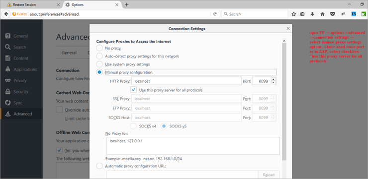 Now, open Mozilla Firefox >> select options >> advance tab >> in that select Network >> Connection settings >>select option Manual proxy configuration. Use the same port as in the Zap tool. I have manually changed to 8099 in ZAP and used the same in the Firefox browser. Check below screenshot of the Firefox configuration set up as a proxy browser.