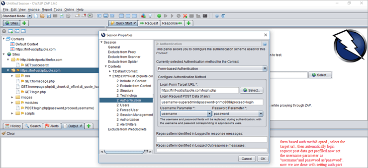 In our example, we need to set the authentication method as Form-based. For this, select the target URL, login request post data field gets pre-filled, after that, change parameter as username and password -> click ok.