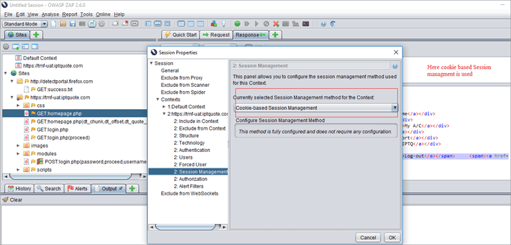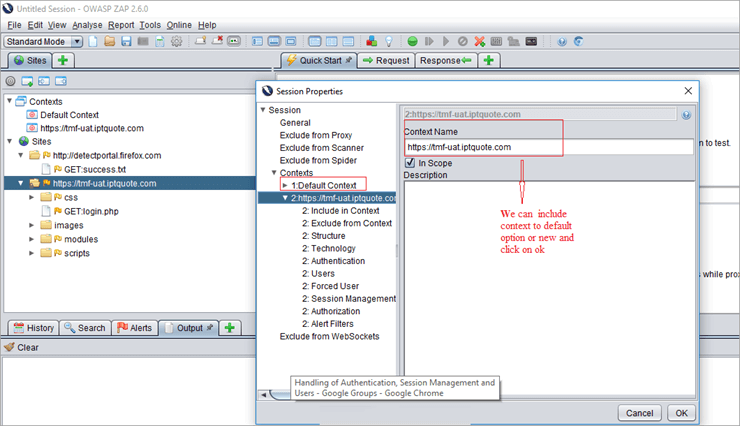 Context: It represents a web application or set of URLs together. For a given Context, new tabs are added to customize and configure the authentication and session management process. The options are available in the session properties dialog .i.e Session properties dialog -> Context -> you can either use the default option or add a new context name.