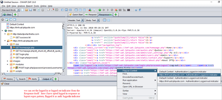 First, launch ZAP and access the URL in the proxy browser. Here, I have taken the sample URL as https://tmf-uat.iptquote.com/login.php. Click on Advanced -> add Exception -> confirm security exception as in page 6 and 7. Then the landing page gets displayed. At the same time ZAP automatically loads the Webpage under Sites as a new session. Refer to the below image.