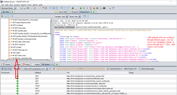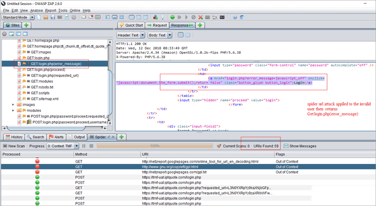 Here, a spider URL attack is applied to the invalid user. In the ZAP interface, we can see Get: login.php (error _message), which means authentication has failed. Also, it doesn’t pass the URLs through inner TMF pages.