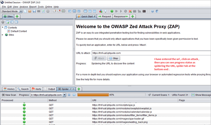 The above screenshot shows the quickest way to get started with ZAP. Enter the URL under the Quick Start tab, press the Attack button, and then progress starts.